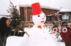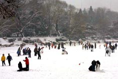 上午11點(diǎn),陶然亭公園潔白的湖面成了公園人氣最旺的地方。人們在冰面上滾雪球、堆雪人、打雪仗、滑冰車。走在公園的小路上,你會跟許多形狀滑稽的雪人不期而遇,它們相貌各異,有的頭插一串鮮花,有的脖子系著五彩繽紛的布條,有的頭頂一片綠色柏樹枝。一群中學(xué)生玩雪的創(chuàng)意更是獨(dú)特:將數(shù)十個拳頭大的雪球串在一棵桃樹的樹枝上,遠(yuǎn)遠(yuǎn)望去,仿佛滿樹盛開著鮮花。