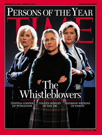 她們分別是強調(diào)喪失有可能避免“九一一”發(fā)生之機的聯(lián)邦調(diào)查局干員科琳·羅利;揭發(fā)電信巨擘世界通訊公司、曾是美國第七大能源交易商安龍公司弊端,導致公司破產(chǎn)的辛西婭·庫珀與莎朗·沃特金斯。