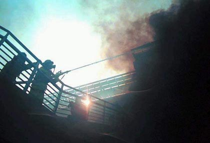 10時09分,指揮部根據(jù)前沿指揮員報告現(xiàn)場偵檢情況,不明氣體屬于有毒腐蝕性不強的氨氣。為避免不必要的傷害,指揮部采取強大的噴霧水流措施驅(qū)散氣體,加強外圍警戒;10點20分,車道內(nèi)的氣體驅(qū)散完畢,指揮部一聲令下發(fā)起總攻,數(shù)百條水龍一齊噴射。