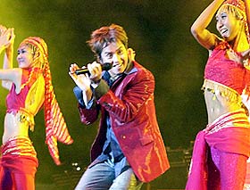 只見阿倫一身金色的服裝,再次出現(xiàn)在觀眾面前。而歌迷也開始離席,跑到觀眾席的最前排,不一會兒,整百位歌迷就在臺前隨著音樂起舞。