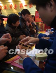 中新網(wǎng)12月27日電 包括50克、100克、200克、500克四種規(guī)格、同一編號(hào)的羊年賀歲金條明天將在北京開(kāi)賣。