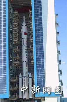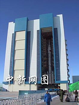 中國酒泉衛(wèi)星發(fā)射中心總裝測試廠房中巍然聳立的“神舟”“神箭”組合體:“神舟”為中國載人航天工程進行第四次飛行試驗的飛船;“神箭”即中國運載火箭技術研究院研制的“長征二號F”運載火箭。中新社記者 孫自法 攝