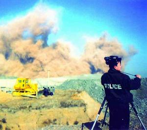 11點(diǎn)30分,爆破總指揮宣布一切正常。爆破現(xiàn)場第一次警報(bào)響起。爆破現(xiàn)場值勤民警開始檢查是否還有人員在爆破區(qū)域內(nèi)停留。一切在爆破區(qū)域內(nèi)的人員撤離至安全地點(diǎn)。16個(gè)爆破觀測(cè)點(diǎn)開始觀測(cè)。