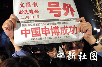 三日晚,在摩納哥夢特卡洛舉行的國際展覽局第132次會議上,中國上海通過激烈竟爭獲得2010年世界博覽會主辦權(quán),當中國申博成功的喜訊從蒙特卡洛傳來的時候,上海全城沉浸在一片歡樂之中。圖為申城市民在為中國申博成功歡呼。作者:湯彥俊