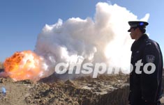 一月三日,北京警方將近期內(nèi)收繳的非法販賣者私自販運(yùn)的煙花爆竹進(jìn)行統(tǒng)一銷毀。作者:李連杰
