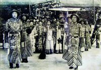 據(jù)南方都市報報道,在珠海發(fā)現(xiàn)的一組清末宮廷黑白照片均為15厘米長、10厘米寬規(guī)格,照片粘在一本封面封底鑲有吉祥圖案花布的折疊本上。其中的一張是慈禧太后坐在荷花池旁,模仿傳說中觀世音的模樣,慈禧太后兩旁立著兩個穿著袈裟、閉目誦經(jīng)的太監(jiān),慈禧太后后面是一幅巨型竹林畫,從照片中還可見到竹林畫中嵌著一塊寫有“普陀山觀音大士”的紙板。