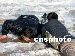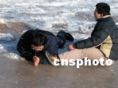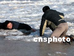 濟(jì)南一市民3日到洛口觀(guān)賞黃河封河奇觀(guān),結(jié)果不甚落入冰窟,幸虧同伴機(jī)智向救,才僥幸生還。3日,黃河出現(xiàn)了歷史上少有的大范圍封河現(xiàn)象,許多市民聞?dòng)嵡皝?lái)目睹這一奇觀(guān)。河務(wù)部門(mén)提醒市民,雖然黃河已經(jīng)冰封,但有些河面上冰層較薄,千萬(wàn)不要在上面行走。