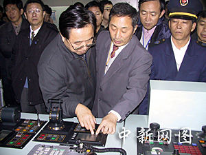 鐵道部部長(zhǎng)傅志寰一定是位技術(shù)出身人士,今天在八級(jí)風(fēng)浪中,他站在了中國(guó)第一條跨;疖囕喍伞盎浐hF一號(hào)”船長(zhǎng)室的主控臺(tái)前,老鐵路了解船舶新技術(shù),聽得津津有味。