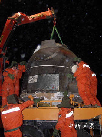 返回艙在內(nèi)蒙古草原著陸后,被吊裝入專用卡車沿公路運(yùn)往北京。孫陽 攝