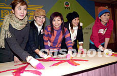 大型慈善籌款節(jié)目「慈善星輝仁濟(jì)夜」1月8日在香港舉行記者會(huì),藝員葉璇、張美妮、朱凱婷、姚嘉妮、劉曉彤(圖左起)在會(huì)上“即席揮毫”作畫。鄧慶樂 攝