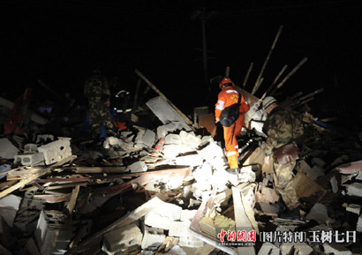20日各地救援隊在結(jié)古鎮(zhèn)災(zāi)區(qū)煙塵中堅持抗震救災(zāi)