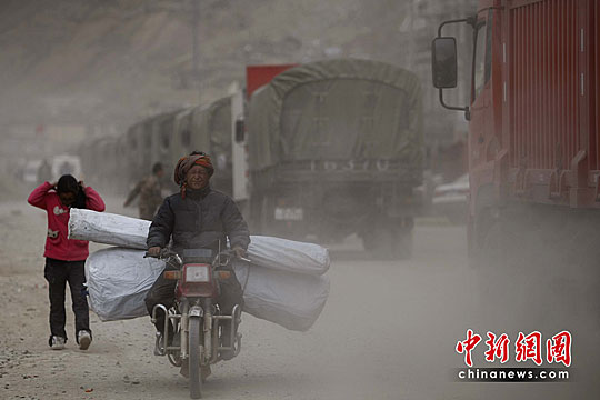 圖:軍民車隊(duì)穿越風(fēng)沙馳援玉樹災(zāi)區(qū)