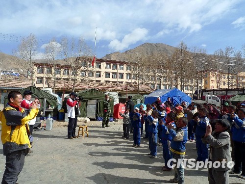 圖:志愿者為玉樹小學(xué)生教授手語(yǔ)操