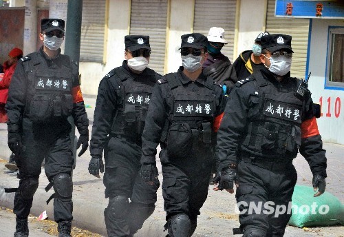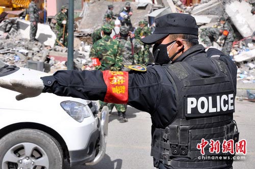 圖:成都特警在玉樹地震災(zāi)區(qū)街頭巡邏