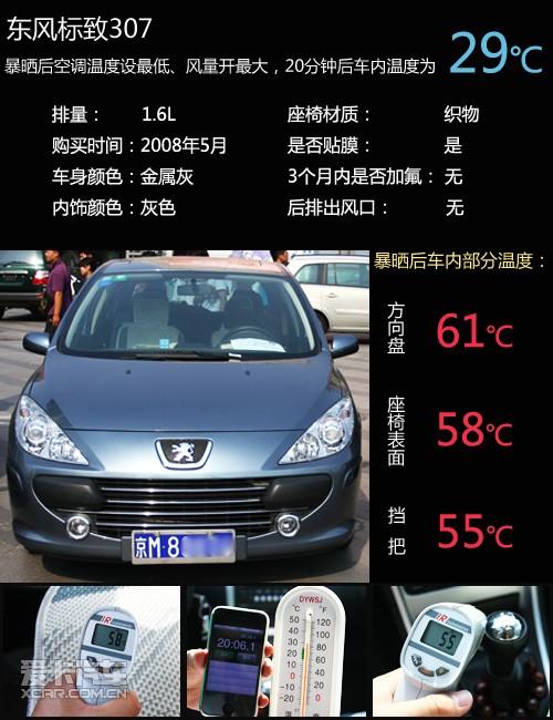 手動標致307的擋把被曬到了55度,握著它超過3秒以上你肯定會不自覺地松手。粗條編織的涼墊貌似對降低座椅溫度功勞不大,但是開啟空調隨著溫度的下降,你會感覺臀部和后背的通風效果更佳。