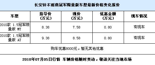 近日,筆者走訪長安鈴木北京4S店了解到,目前已經(jīng)批量到店一批2010款長安鈴木雨燕冠軍限量版車輛。購車可以讓利8000元。具體詳情見下表: