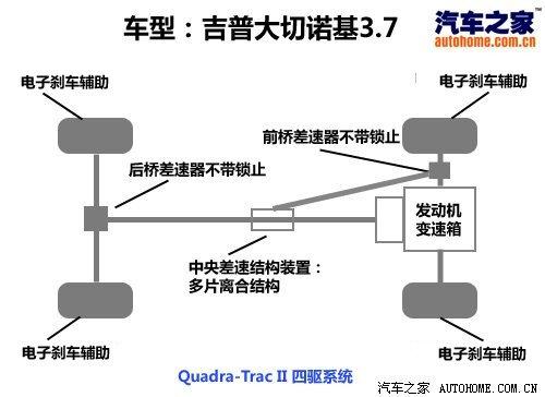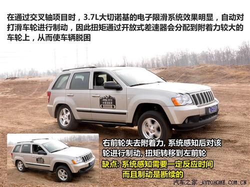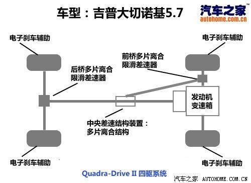 大切諾基采用前后整體橋的非獨(dú)立懸掛,這在結(jié)構(gòu)在本身上也偏重越野。進(jìn)入國(guó)內(nèi)的大切諾基有兩款車(chē)型,排量分別為3.7升和5.7升,兩款車(chē)型采用的四驅(qū)結(jié)構(gòu)并不相同,主要體現(xiàn)在3.7升車(chē)型前后軸上沒(méi)有差速鎖,盡管它的電子輔助系統(tǒng)也足夠強(qiáng)大,但在通過(guò)一些難度較大的交叉軸項(xiàng)目時(shí),電子輔助還是比機(jī)械結(jié)合反應(yīng)緩慢一些。