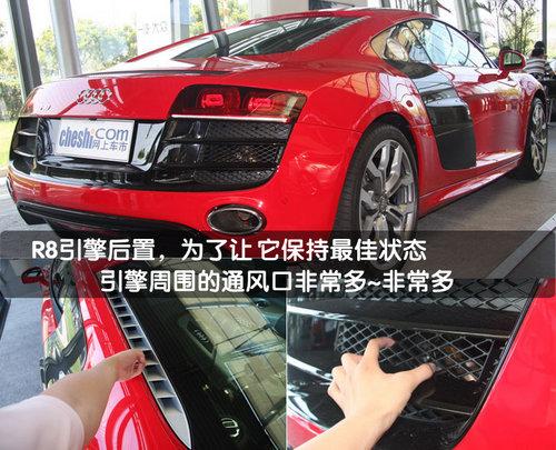 奧迪R8的駕駛艙相對靠前,而在駕駛艙之后則是巨大的引擎室——這是典型中置發(fā)動機賽車的特征,這種設(shè)計也大大優(yōu)化了車身前后比例,使R8的前后重量分達到了44:56。透過R8后方透明的發(fā)動機罩,V10 5.2升FSI發(fā)動機安靜的伏臥其中。在設(shè)計師所營造的視覺效果下,人們很容易把它與賽車聯(lián)系在一起。即便在一個不了解賽車的人面前,也一定能從中看出它的與眾不同和獨一無二。