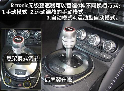 作為這臺(tái)發(fā)動(dòng)機(jī)的動(dòng)力輸出,奧迪R8可以選配“R tronic無(wú)級(jí)變速器”,或手動(dòng)6速變速器,不過試駕的車輛均為R tronic無(wú)級(jí)變速器。這臺(tái)R tronic無(wú)級(jí)變速器的優(yōu)勢(shì)在于可以營(yíng)造4中不同的換檔方式即:1.純手動(dòng)模式2.運(yùn)動(dòng)調(diào)教的手動(dòng)模式3.純自動(dòng)模式4.運(yùn)動(dòng)型自動(dòng)模式。利用變速器的模仿依然能夠在手動(dòng)狀態(tài)下提供6個(gè)前進(jìn)檔位的傳動(dòng)比。