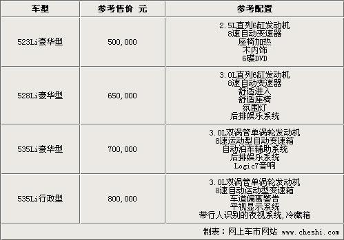 從經(jīng)銷商處得到的消息來看,目前接受預(yù)定的新5系Li為3款“豪華版”車型和一款從未出現(xiàn)過的“行政版”車型。“豪華版”在寶馬的車型分類體系中屬于最高級(jí)別,但“行政版”是首次出現(xiàn)應(yīng)該會(huì)是寶馬新5系li的旗艦款式。不過根據(jù)以往寶馬對(duì)車型的分布來看,在豪華版之下還包括領(lǐng)先型、標(biāo)準(zhǔn)型等,這也就意味著在上述50到80萬元的價(jià)格區(qū)間內(nèi),新5系Li還將衍生出更多配置版本的車型,其中也一定不乏一些價(jià)位更低的車款。