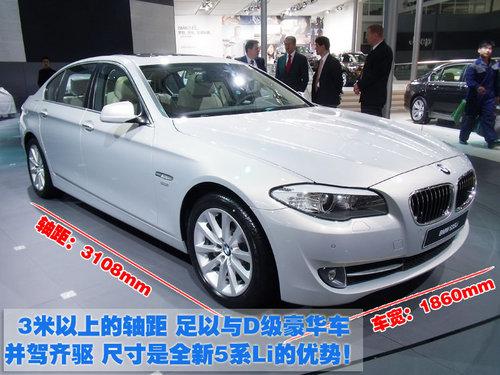 2010年北京車展現(xiàn)場(chǎng),位于W4的寶馬展臺(tái)可謂是異;鸨R?yàn)榇舜蜝NW帶來了全球首發(fā)車型——由華晨寶馬生產(chǎn)的新5系Li車款。在國(guó)內(nèi)同檔次、同價(jià)位的高級(jí)車當(dāng)中,新5系Li擁有最長(zhǎng)的軸距和豐富的科技配置。那么下面我們就來仔細(xì)的了解一下這款專為中國(guó)市場(chǎng)研發(fā)的新5系Li。