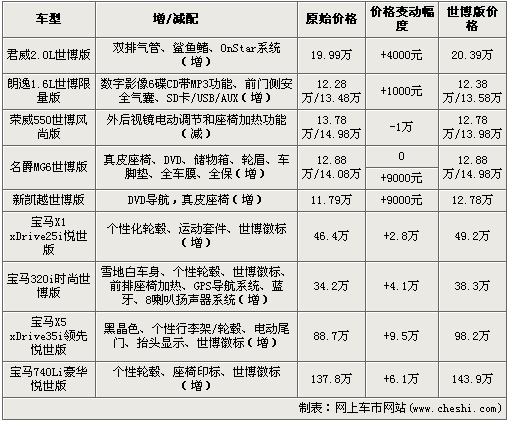 不同品牌共推出9款世博版車型,范圍從自主到進(jìn)口,從緊湊級(jí)到頂級(jí)豪華車,體現(xiàn)出世博這一世界人類盛會(huì)的巨大影響力。車型全部采用增加或較少配置的做法進(jìn)行改款,最高價(jià)格漲幅達(dá)到了9.5萬,降價(jià)車型只有一款,降幅為1萬。
