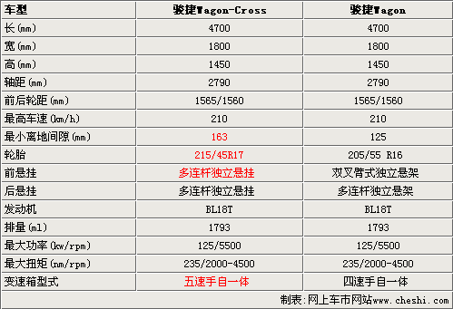 新駿捷WagonCross與駿捷Wagon的車身尺寸基本沒有變化,長寬高分別是4700/1800/1450毫米,軸距和前后輪距也沒有變化。但新駿捷WagonCross加大了離地間隙,達(dá)到了163毫米。另外,新駿捷WagonCross配備的是17英寸輪胎,而駿捷Wagon則配備16英寸輪胎。新駿捷WagonCross采用前后多連桿式設(shè)計(jì),駿捷Wagon則采用雙叉臂式獨(dú)立懸架。在動(dòng)力方面,這兩款車并沒有太大差別,只不過新駿捷WagonCross采用五速手自一體變速器,比老款駿捷Wagon有很大提高。