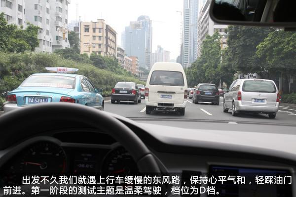 我們以D檔在市內(nèi)溫柔地行駛了約200公里,遇見紅燈必減速停車,絕不嘗試僥幸通過,堅(jiān)決不踩地板油,不急加速超車,行車電腦顯示百公里平均油耗為9.1L。雖然與廠家公布的油耗數(shù)據(jù)有明顯出入,但面對這走走停停的路況,能維持在百公里9L左右的水平,可以了。另外補(bǔ)充一下,由于測試當(dāng)天廣州處于高溫狀態(tài),路上地面溫度估計(jì)超50度,所以全程開空調(diào),消耗部分燃油。