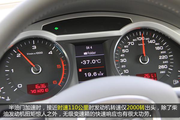 人多車多,廣州特色,都城已經(jīng)成為廣州人生活的一部分。面的蠕動似的前進(jìn),發(fā)動機(jī)轉(zhuǎn)速僅比怠速高一點(diǎn)點(diǎn)即可驅(qū)動車輛前進(jìn)(約1200轉(zhuǎn)/分鐘),能把轉(zhuǎn)速控制在如此低的水平,正是柴油發(fā)動機(jī)低速大扭矩的體現(xiàn)。但在這樣的環(huán)境中,并沒多少機(jī)會能給渦輪增壓系統(tǒng)發(fā)揮,渦輪打開的轉(zhuǎn)速為1400轉(zhuǎn)/分鐘,憋屈著。由于轉(zhuǎn)速較低,加上奧迪出色的隔音做工,車內(nèi)非常安靜,聽著BOSE音響美妙的樂章,就算路上再堵也能保持心情舒暢。