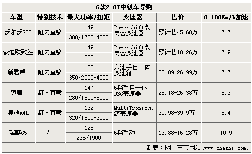 我們看到上述6款車中,有5款發(fā)動機(jī)是采用缸內(nèi)直噴技術(shù),三款采用了雙離合變速器,只有來自自主的瑞麒G5要遜色很多,不過價格方面的優(yōu)勢是明顯的。在功率、扭矩方面,新君威優(yōu)勢明顯,體現(xiàn)在0-100Km/h加速上也是僅7.7秒,與年底上市的沃爾沃S60相當(dāng)。而蒙迪歐致勝考慮到沃爾沃與福特的關(guān)系,至少從參數(shù)上看與S60的2.0T發(fā)動機(jī)很可能是同一款。