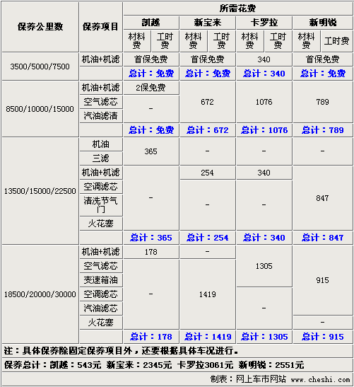 別克新凱越首保時(shí)間是四款車(chē)型中最短的,但廠(chǎng)家提供前兩次免費(fèi)保養(yǎng),這點(diǎn)看來(lái)還比較貼心。18500公里結(jié)算后,543元的總保養(yǎng)金額是四款車(chē)中最少的一個(gè)。新寶來(lái)和新明銳同為大眾品牌下車(chē)型,但由于合作商不同,保養(yǎng)的費(fèi)用還是存在一些細(xì)微的差距,都在2600元范圍內(nèi)。日系車(chē)一貫是經(jīng)濟(jì)實(shí)惠見(jiàn)長(zhǎng),但在后期保養(yǎng)的方面豐田卡羅拉的費(fèi)用卻是四款車(chē)中最高的,超過(guò)3000元的數(shù)字也是新凱越保養(yǎng)費(fèi)用的5倍多。