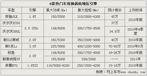 奔馳GLK和沃爾沃XC60作為原裝進口車型,將于今年年底左右分別引入搭載1.8和2.0排量的渦輪增壓引擎的車型。而作為國產(chǎn)合資車型的新5系Li、沃爾沃S80L、新SLS賽威、致勝、新索納塔等車型,也將紛紛推出各自排量的渦輪增壓車型。除此之外,作為自主品牌代表的一汽奔騰B70,也將推出搭載大眾1.8TSI渦輪增壓燃油直噴引擎的車型。
