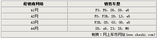 另?yè)?jù)了解,比亞迪M6將在A4網(wǎng)中銷售,其他車型還包括I3、I6等未上市新車和e6新能源車,已上市的只有S8跑車。而A1、A2、A3網(wǎng)絡(luò)的新車推出規(guī)劃已經(jīng)接近完成,只有像S6、G6等少數(shù)車型未上市銷售。