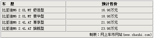 據(jù)比亞迪經(jīng)銷商處銷售人員介紹,M6將在20日正式上市,預(yù)熱宣傳活動(dòng)已經(jīng)全面展開,將推出2.0L手動(dòng)舒適型、豪華型和2.4L自動(dòng)尊享型、旗艦型,預(yù)定價(jià)為16.98-23.98萬,前期預(yù)定該車的客戶可享受優(yōu)先提車、提車不加價(jià)等優(yōu)厚待遇。