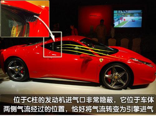 當(dāng)通過車身兩側(cè)的氣流經(jīng)過駕駛室后方的C柱時(shí)候,隱藏在C柱內(nèi)部的引擎進(jìn)氣口恰好在這里等待著新鮮的空氣。通過位于C柱內(nèi)的引擎進(jìn)氣口,發(fā)動(dòng)機(jī)將獲得充足的新鮮空氣,并且法拉利的工程師還告訴我們:當(dāng)車輛的時(shí)速達(dá)到100公里/小時(shí)開始,由于氣流經(jīng)進(jìn)氣口以及進(jìn)氣道所產(chǎn)生的“動(dòng)態(tài)增壓”效應(yīng),會(huì)使發(fā)動(dòng)機(jī)的功率額外增加5馬力,最終實(shí)現(xiàn)570匹馬力的最大功率。