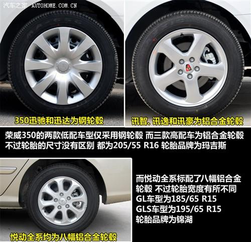 榮威350在高低配車型上有兩種不同的輪轂,但輪胎的尺寸都是205/55 R16。而悅動(dòng)則是全系標(biāo)配8幅鋁合金輪轂,但在低配車型上僅使用了185/65 R15輪胎,而高配車型上將輪胎的寬度升級(jí)到195。從效果上看,榮威350更寬更大的輪胎顯然更漂亮,但悅動(dòng)標(biāo)配鋁合金輪轂更厚道一些。