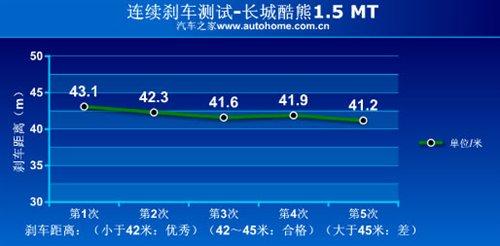 除了出色的乘坐和儲(chǔ)物空間,酷熊的動(dòng)力和經(jīng)濟(jì)性也有不錯(cuò)的表現(xiàn),從其連續(xù)制動(dòng)的工況圖中可以看出,酷熊的平均制動(dòng)距離在42米左右,且剎車(chē)系統(tǒng)的穩(wěn)定性也比較強(qiáng)。而在油耗測(cè)試中,6.7L/百公里的成績(jī)也低于我們的預(yù)期。