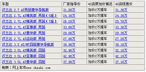 豐田漢蘭達(dá)有著寬大的車身,擁有創(chuàng)新的、寬敞的內(nèi)部空間,并配備了豪華、舒適的內(nèi)飾。而且,漢蘭達(dá)標(biāo)配了同級別車型中最高標(biāo)準(zhǔn)的安全裝備。這款SUV行駛中非常安靜,而且靈敏性超凡,將多功能性和駕駛舒適性匯于一身。根據(jù)網(wǎng)上車市價(jià)格監(jiān)測系統(tǒng)顯示,目前廣汽漢蘭達(dá)最高優(yōu)惠現(xiàn)金8千元,最低售價(jià)27.28萬元,車源較緊張,詳細(xì)價(jià)格如下表: