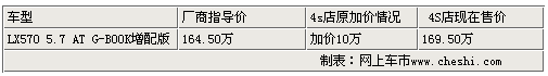 如果提到豪華SUV,大家一定首先想到寶馬X6、奔馳GL、保時(shí)捷卡宴以及路虎攬勝等豪華SUV中的“大佬”們,作為國(guó)際知名越野極強(qiáng)悍的汽車(chē)品牌,雷克薩斯的每一款車(chē)型都可謂經(jīng)典,而雷克薩斯LX570又重新詮釋了豪華SUV的新尺度,與上一代的LX470相比,你卻不得不承認(rèn)雷克薩斯的LX系列正在以跨越的方式完成自己的進(jìn)化。近日,近日根據(jù)網(wǎng)上車(chē)市價(jià)格檢測(cè)系統(tǒng)顯示,目前雷克薩斯豪華SUV-LX570加價(jià)較上段時(shí)間的10萬(wàn)元較少了一半,僅加價(jià)5萬(wàn)進(jìn)行銷(xiāo)售,而且有現(xiàn)車(chē)供應(yīng),具體情況請(qǐng)參照下表: