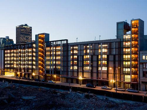 這座耗資2800萬美元,由舊百貨商場(chǎng)翻修而成的車庫(kù),在設(shè)計(jì)中采用了老溫哥華橋的部件。