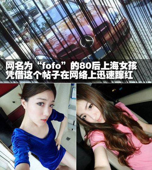 一個(gè)網(wǎng)名為“fofo”的80后上海女孩在某知名論壇中發(fā)帖《曬曬我的大奔,你們有嗎?!》,并且貼出了不少靚照,曬自己的奔馳SLK和奢靡生活。就這樣一個(gè)帖子,在短短2小時(shí)內(nèi)被蓋到100樓,點(diǎn)擊率高達(dá)了近10萬(wàn),并被很多網(wǎng)友轉(zhuǎn)載到各大論壇,成為最熱點(diǎn)的帖子。