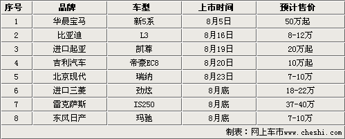 時(shí)間進(jìn)入到8月份以后,我國(guó)絕大部分城市都已經(jīng)進(jìn)入到了真正的夏天,伴隨著酷熱的天氣各大汽車廠商也紛紛選擇了盛夏時(shí)節(jié),發(fā)布他們自己的最新產(chǎn)品。據(jù)記者統(tǒng)計(jì),在2010年8月份里來(lái)自國(guó)產(chǎn)和進(jìn)口各類新車達(dá)到了8款之多,平均每周就有就有2款新車與我們見(jiàn)面。對(duì)于要即將上市的新車,消費(fèi)者的關(guān)注度自然是很高的,下面就讓我們提前去看看。