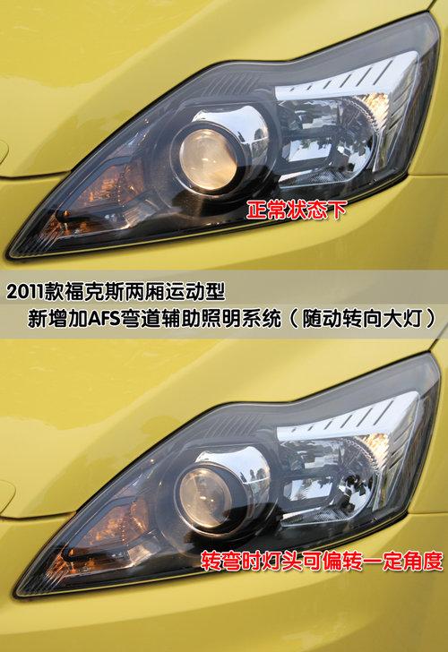 2011款?怂箖蓭\(yùn)動(dòng)型在安全配飾上新增加了AFS彎道輔助照明系統(tǒng),AFS是彎道輔助照明系統(tǒng)的縮寫(俗稱彎道大燈)。AFS系統(tǒng)有三種形式:1、轉(zhuǎn)向頭燈形式的,就是頭燈內(nèi)燈具可以左右旋轉(zhuǎn)8°至15°照明彎道死角。 2、利用獨(dú)立彎道照明系統(tǒng)的,就是在燈具里有一個(gè)固定的燈泡照向彎道,轉(zhuǎn)彎時(shí)候自動(dòng)點(diǎn)亮。3、利用左右霧燈進(jìn)行彎道時(shí)候照明,轉(zhuǎn)向時(shí)候?qū)?yīng)彎內(nèi)側(cè)霧燈亮起,照明彎道死角。而2011款?怂箖蓭\(yùn)動(dòng)型采用的是第一種形式,增強(qiáng)了夜晚行車的安全性。