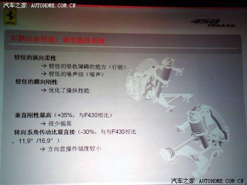 該車采用的新型底盤亦為鋁制,在底盤設(shè)計(jì)過(guò)程中,馬拉內(nèi)羅的工程師不僅運(yùn)用了各類先進(jìn)的合金材料,同時(shí)也從航空航天業(yè)借鑒了尖端的制造和焊接技術(shù)。在車輛動(dòng)力方面,法拉利458 Italia的懸掛系統(tǒng)在前部配備了雙叉骨,而后部則采用了多鏈系統(tǒng),借以提供最大的附著力和無(wú)與倫比的操控性能。該車的轉(zhuǎn)向傳動(dòng)比更加快捷高效,在實(shí)現(xiàn)極速入彎的同時(shí)也能保證超凡的駕駛舒適度。