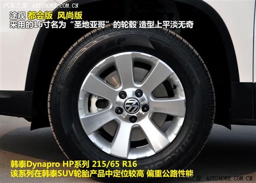 途觀的都會版和風(fēng)尚版分別是低配和中配車型,兩者采用了名為“圣地亞哥”的16寸輪轂,造型上平淡無奇,搭配了215/65 R16的輪胎,品牌為韓泰Dynapro HP系列,在全系韓泰SUV輪胎產(chǎn)品中,該系列定位是“豪華SUV的高性能輪胎”,盡管官方的描述難免有些夸張,但不難看出它強(qiáng)調(diào)的是操控性能,這也與途觀的定位非常吻合,但是215mm的寬度對于SUV來說有些偏窄。
