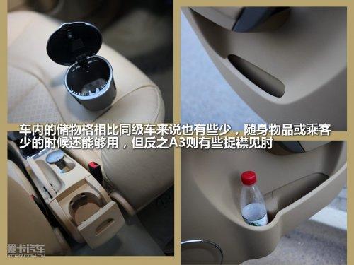 車內(nèi)的儲(chǔ)物格相比同級(jí)車來說有些少,移動(dòng)煙灰缸占用了一個(gè)杯架,手機(jī)、煙盒等等則占用了另一個(gè),而杯架真正的主人只能放在車門上了。其方向盤左側(cè)提供了一個(gè)儲(chǔ)物格,只是這個(gè)儲(chǔ)物格開開關(guān)關(guān)的實(shí)在不方便,所以只能放洗車卡之類的不太常用的東西。也許這么看A3的儲(chǔ)物格夠了,可是如果隨身的東西再多一些,A3的儲(chǔ)物空間就捉襟見肘了。