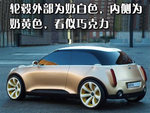MINI Core概念車采用內凹陷七幅白色輪轂,內側噴涂的是奶黃色,造型非?蓯劬腿缬汕煽肆χ瞥梢粯印