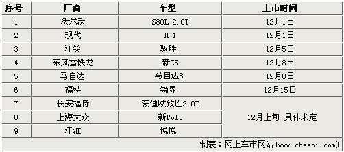 其中,在12月1日就將有兩款新車上市,分別為S80L 2.0T和現(xiàn)代H-1,另外還有江鈴馭勝、新C5、馬自達(dá)8等三款新車也確定了具體上市時(shí)間,而江淮悅悅、新Polo、GX2等4款車上市時(shí)間未定。從上表可以看到,這9款新車涵蓋了小型車、中級(jí)車、豪華車、SUV及商務(wù)車等不同類型,可以滿足消費(fèi)者各項(xiàng)用車需求。
