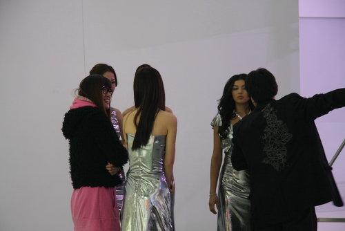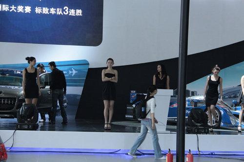 接下來看到的是標致展臺,模特已經(jīng)嚴陣以待,進入了彩排階段,正式服裝已經(jīng)上身,黑色的套裙裝體現(xiàn)性感的一面。美女們站一排,有點眼花繚亂啊。
