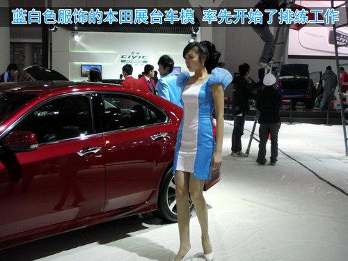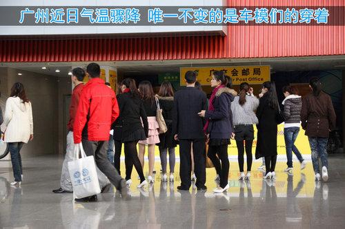 車(chē)模的誘惑力往往更大,雖然距離車(chē)展還有2天,但她們已經(jīng)開(kāi)始了排練試演,于此同時(shí)在她們身后的一些車(chē)輛卻成了陪襯。外近日廣州的氣溫驟降,白天大約在10幾度,許多人增添了較厚的衣服,但車(chē)模們依舊短裙出鏡。